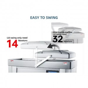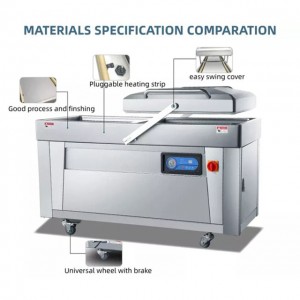 Mesin ini dilengkapi dengan dua ruang vakum yang memungkinkan proses pengemasan dilakukan secara berkelanjutan. Saat satu ruang digunakan untuk proses vakum dan penyegelan, ruang lainnya sudah dapat disiapkan untuk batch berikutnya. Hal ini membantu mengurangi waktu henti dan secara langsung meningkatkan efisiensi kerja.