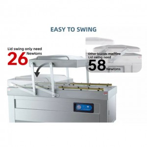 Didesain khusus untuk kebutuhan produksi skala menengah hingga besar, mesin ini dilengkapi dengan dua ruang vakum independen yang bekerja secara bergantian. Sistem ini memungkinkan proses vakum dan penyegelan dilakukan tanpa jeda, sehingga waktu pengemasan menjadi jauh lebih singkat dan kapasitas produksi meningkat secara signifikan.